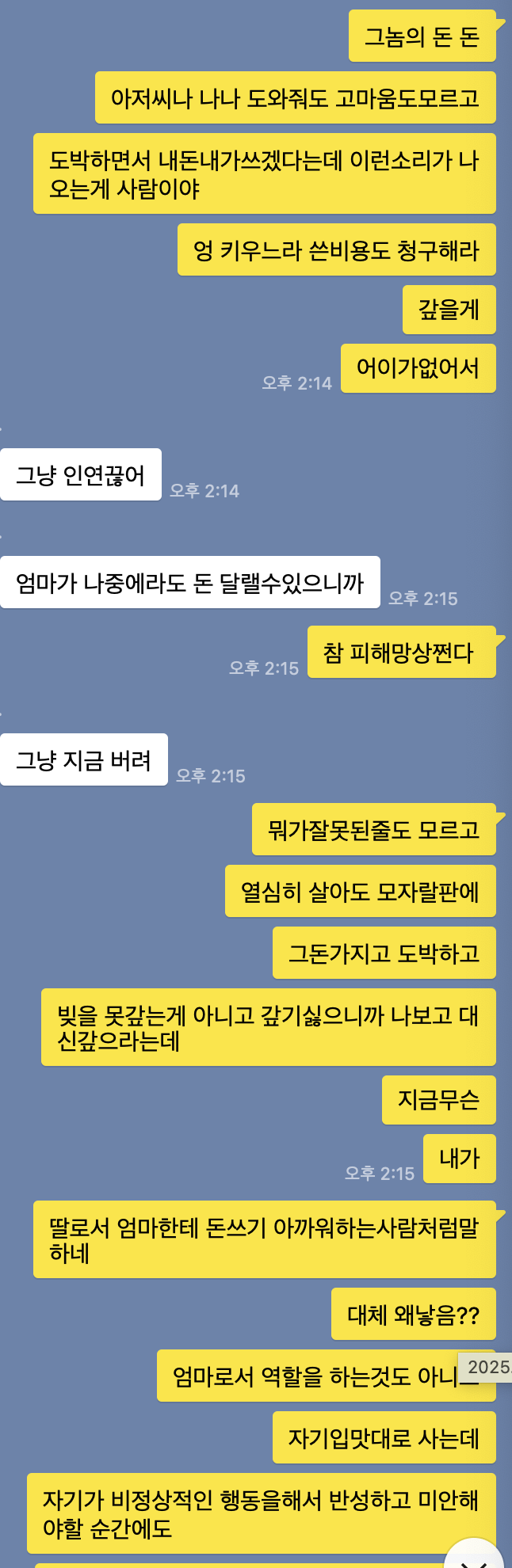 아래는 카톡내용이고 저는 어떻게 대처해야할지 모르겠습니다. 저는 딸로서 도리도 최선도 다 했다고 생각하고 뭘 잘못한지도 모르겠습니다. 용돈 이삼백씩 줄때면 이번달은 살았다는 식으로 기뻐하는 모습에 마음아프고 도울수있어서 좋다는 마음뿐이었는데 이제와서 자기가 언제 돈달랬냐고 되물으니 전 지금껏 뭘위해 도왔나싶어요. 제가 인연끊자는 소리 들을정도로 뭘 잘못했나요? 엄마가 도박하면서 사는데 그걸 엄마 인생이라고 존중해줬어야 맞나요? 전에도 엄마가 화난다고 인연끊자한거 넘겼었는데 이번에 또 이러니까 저도 막말한거 후회하지말고 엄마나 연락하지말라고 받아치긴했어요.
