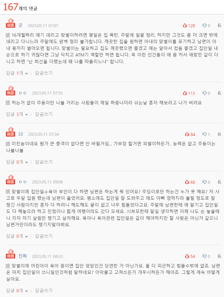 제가 정말 게으르고 더러운건지 남편놈이 이상한 놈인지좀 봐주세요 30대 중반에 육휴 끝나고 현재 복직해서 일하고 있어요 아기는 16개월도 안됫어요 . 얼집 다니고 있고 남편은 3교대 근무예요 일단 저는 아기가 나름 일찍 일어나는 편이라 기상하면 저는 대충 세수 하고 머리는 전날 저녁에 미리 감아요(아침에 감을 시간이 없어서) 그리고는 아기가 잠깐 혼자 놀고 있을때 빨리 아침에 밥 준비하고 아기 밥 먹이는데 아기가 빨리 먹어주면 좋겠지만 놀면서 먹고 하느라 30분 이상 걸려요 그러다보면 어느덧 츌근 시간이 얼마 안남아요 밥 다 먹이고 나면 영양제 챙겨 먹이고 옷 꺼내서 입히는데 아기가 가만히 앉아서 입어주면 좋겠지만 놀고싶어 그런지 계속 돌아다니느라 벗겼다 입혔다 반복하고 정신 없더라구요 다 입혔는데 갑자..