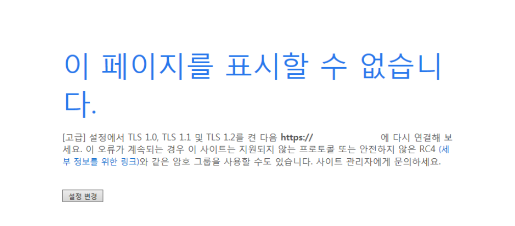 메세지 설정에서 tls 1.0 tls 1.1 및 tls 1.2를 켠 다음 ~ 에 다시 연결해보세요. 원인 SSL이 적용된 사이트 접속할 때 사용하는 Window TLS가 낮은 경우 발생하는 문제입니다. 해결방법 1. 운영체제 업데이트 아래 운영체제를 사용중이라면, 운영 체제를 TLS 1.2를 지원하는 버전으로 업그레이드하십시오. Windows Server : Windows Server 2008 R2 이상 Windows 데스크탑 : Windows 8 이상 Mac OS X : Mac OS X 10.8 이상 2. Windows 7 추가설치(권장X) Windows 7을 사용하고 있다면, TLS 1.2를 활성화해야 합니다. Windows 7을 최신으로 업데이트합니다. EasyFix.msi를 설치하여 Default..