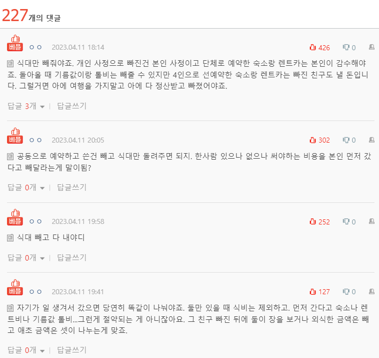 지난 주말에 친구들 3명하고 같이 2박 3일로 여행을 다녀왔어요 경비는 저희가 인당 60씩 돈을 미리 낸 상태였고, 240만원으로 1. 숙박비 80만원 2. 렌트카 46만원 3. 기름값,톨비 : 왕복 14만원 4. 식대 뭐 대충 이렇게 돈을 썼는데요 친구 중 하나가 둘째날 아침에 일이 갑자기 생겨서 먼저 갔어요. 그리고 오늘 이제 돈 정산하고 남는거 돌려주려고 하면서 서로 말이 많아졌는데요. 우선 식대는 같이 먹은거 까지만 내기로 하는거는 서로 동의했는데, 나머지 부분이 서로 생각이 다릅니다. 1. 먼저 간 애 입장 : 본인은 1박만 했고, 집에 알아서 갔으니 숙박비는 1박만, 렌트카도 1박, 기름값톨비도 7만원까지만 1/4 하겠다. 2. 저를 제외한 두명 : 먼저 간 건 너 사정이고, 숙박도 예약을 한..