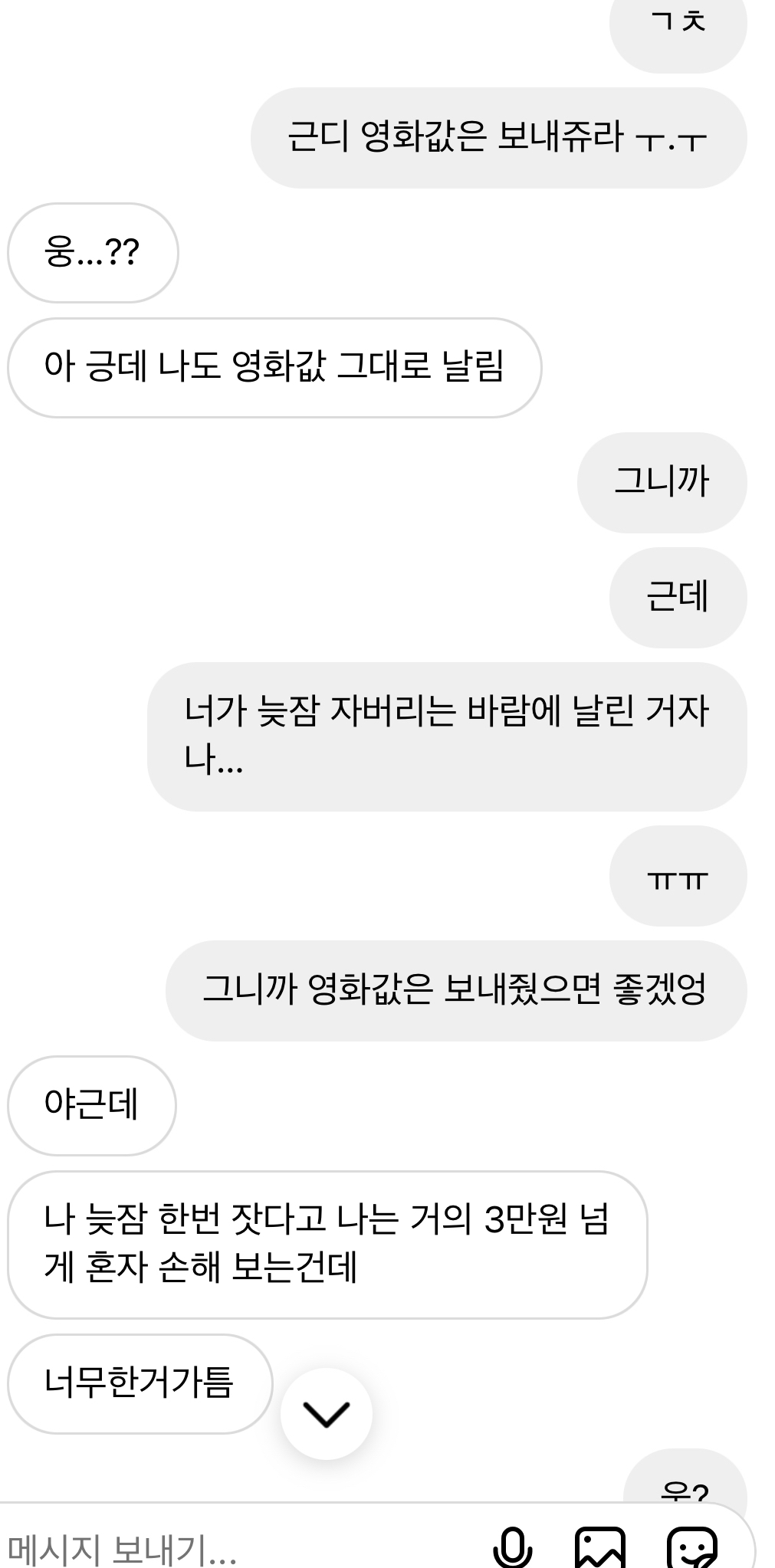 친구랑 영화 보기로 해서 내가 돈 보내고 친구가 예매했음 근데 얘가 늦잠 자서 아예 나오지도 않음 나는 약속 장소에서 기다리다가 집에 감 그럼 적어도 영화값은 나한테 돌려줘야 하는 거 아니야…?ㅠㅠ 자기 혼자 영화 본 것도 아니고 둘이 같이 돈 날렸으니까 걍 넘어가자는데 뭔소린지모르겠음하… + 돈 보내달라고 했고 결국 다음 날 준다고 해서 오늘 받음…ㅋㅋ 근데 다른 친구한테 나 뒷담까려고 디엠 보냈다가 나한테 바로 걸림 그래서 불만 있으면 나랑 대화해서 풀자고 보냈는데 안읽씹 중이야ㅋㅋㅋㅋㅋㅋㅋㅜㅜ 하 진짜 왜이러냐ㅔ