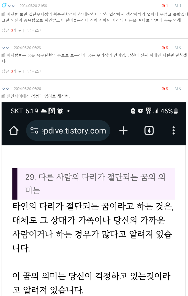 [네이트판] 남친이 내꿈꿨다는데 ㅈㄴ소름돋아 어제 만났는데 자기 꿈에 너가 나왔다면서 막 얘기를 하는거임 그래서 내가 뭔꿈이냐고 물어봤는데 우물쭈물대면서 말을 안해줌 그래서 야한 꿈인줄 알고 괜찮으니까 말해봐 이럼서 장난쳤는데 내 ㅅ지 절단내는 꿈 꿨대... 지가 말하면서도 내눈치를 ㅈㄴ보는데 속 안좋아져서 걍 알바가야된다하고 헤어짐 도대체 무슨 생각을 하고 살면 그런 꿈을 꾸지? 너무 소름돋아서 연락도 못하겠음 계속 전화오고 카톡오는데 못보겠음 네이트판 2024.05.30