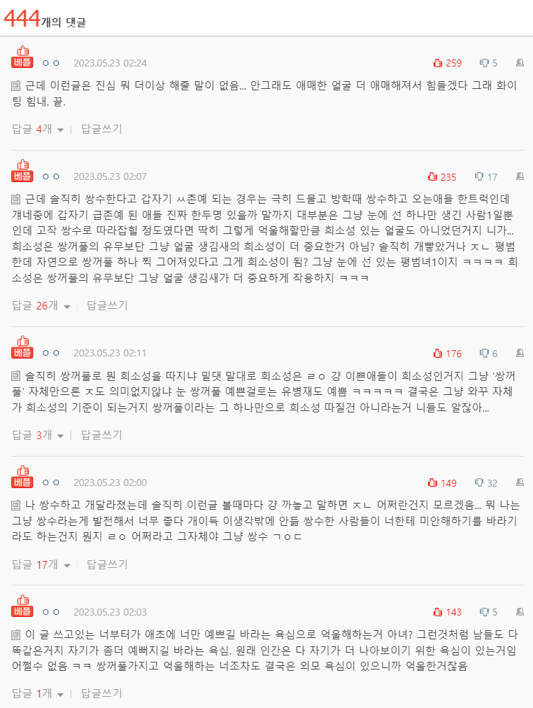 솔직히 말해서 나 어렸을때부터 예쁘다는 소리 좀 많이 듣고 자랐어 그렇게 연예인처럼 이쁜건 아닌데 그냥 학교다닐때 반에서 제일 예쁜애.. 하면 나였고 내얼굴이 다른건 다 그냥 평타치는데 눈이 크고 쌍커풀이 진해 그런데 어느순간부터 정말 그냥 쌍수는 시술이라고 생각하고 너도나도 쌍수 전부 다하고..그리고 나는 원래 얼굴이 그런건지 내가 못 꾸미는건지는 모르겠는데 진하고 화려한 화장이 잘 안어울렸어ㅜㅜ그래서 맨날 아이라인도 눈꼬리만 그리고 다니는데 주위애들이 화장을 본격적으로 시작하면서 화장+성형으로 나보다 예쁜애들, 눈큰애들이 차고넘치더라.. 솔직히 이런생각 하면 안되는건 알지만 나보다 이쁜애들 거의 없었는데 갑자기 어디서 다 나타난건지.. 예전에 내 아이디는 강남미인보고 솔직히 공감했어. 말이 안되는 소..