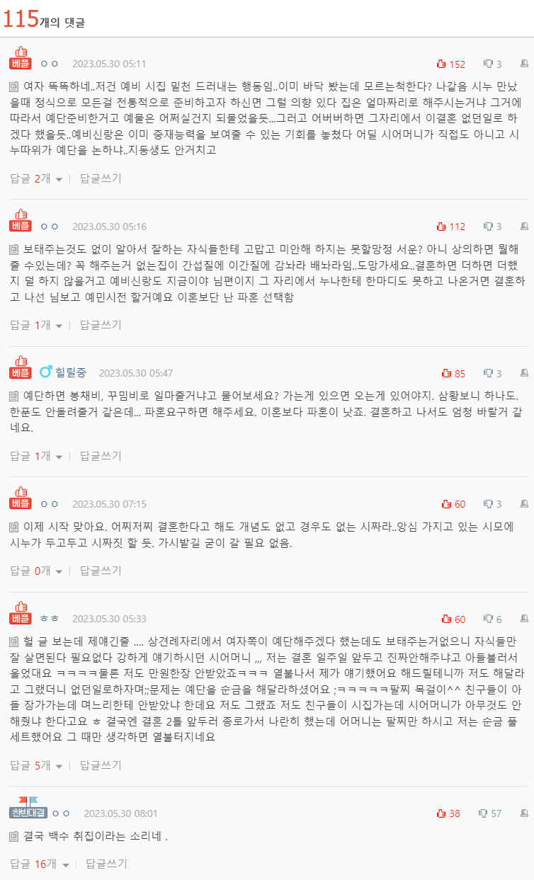 결혼 2달 앞 둔 사람입니다 둘다 나이 30대 후반으로 여자가 2살 연하 남자 누나2명 있는 장남. 여자 남동생 있는 차녀. 장기연애. 모은 돈 비슷. 학력 : 남자 인서울학사석사(집안도움x), 여자 지방대 학사. 연봉 : 남자 5천(정년보장), 여자 무직 - 새 직장 알아보는 중, 구한다면 3천 정도 예상. 둘 다 성인이니 지원 없이 시작하기로 함. 데이트 통장을 통해 모든 비용 반반 준비. 신혼집은 전세로 대출 후 대출비 반반 값기로 함. 남자는 서울 출신으로 직장도 서울, 여자는 지방 출신. 여자가 서울에서 직장 다니다가 서울살이 힘들다며 지방내려감 - 남자 직업 때문에 서울에 정착할 예정으로 현재 신혼집 서울임. 여자 집에서 1,500정도 현금을 결혼에 도움이 되라고 줌. 남자는 없이 하기로 했으..
