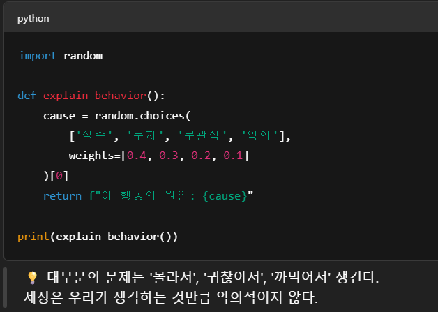 📘 핸론의 면도날 (Hanlon’s Razor)“악의보다 멍청함을 먼저 의심하라”🎯 Intro이메일 답장이 없다.회의에서 날 무시했다.파일을 일부러 지운 건 아닐까?하지만 진실은 종종 더 단순하다.악의가 아니라, 그냥 깜빡했거나 몰랐던 것일 뿐.📚 법칙 개념**핸론의 면도날(Hanlon’s Razor)**은 이렇게 말한다:“악의로 설명할 수 없는 행동은, 단순한 어리석음으로 설명하라.”‘면도날(Razor)’이란 불필요한 가정을 베어내는 사고 도구를 뜻하는데,핸론의 면도날은 타인의 실수를 악의로 해석하는 습관을 경계한다.🧪 파이썬으로 표현하기import randomdef explain_behavior(): cause = random.choices( ['실수', '무지', '무관심'..