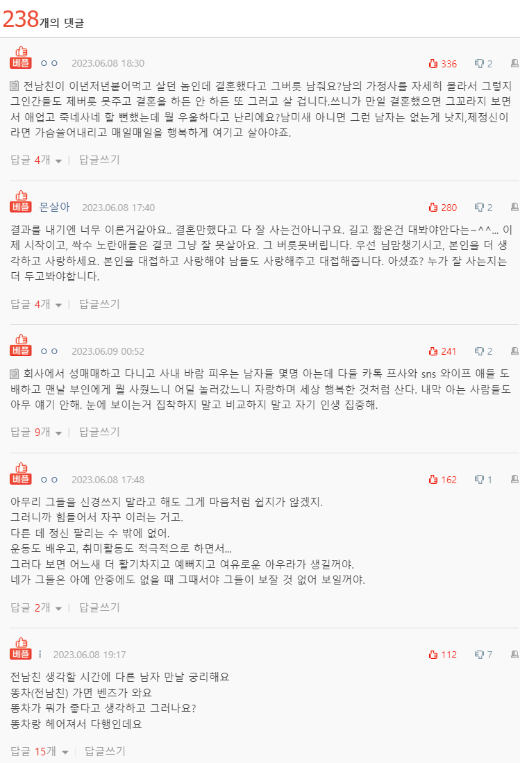5년을 만나다 남친이 양다리여서 헤어졌어. 사귀는 동안에도 별로 좋은 남자는 아니었지만 그때는 안 좋은 모습을 보면서도 어리석은 연애를 했어. 공공기관의 지방사업소에서 근무하느라 가족과 친구등 기존 환경과 떨어져 있어서 제대로 사람을 보지 못 했다고 변명좀 할게. 결국엔 거하게 배신 당했고 그 놈은 양다리였던 여자와 바로 결혼하더라구. 그건 천만다행이라 생각해. 양다리여자가 나타나지 않았다면 내가 결혼할 뻔 했거든. 그때 바보같이 그 남자를 잡을뻔 했는데 그 남자는 거들먹거리며 누가 더 잘 사는지 경쟁해보는 것도 재밌지 않겠냐..고 했어 요즘 자꾸 그 말이 후벼파. 같은 회사라 그 남자의 소식을 알수 있는데 애도 낳고 너무 잘 살고 있는거야. 근데 난 그후 결혼은 커녕 연애도 하지 못 했고.. 집에 안 ..