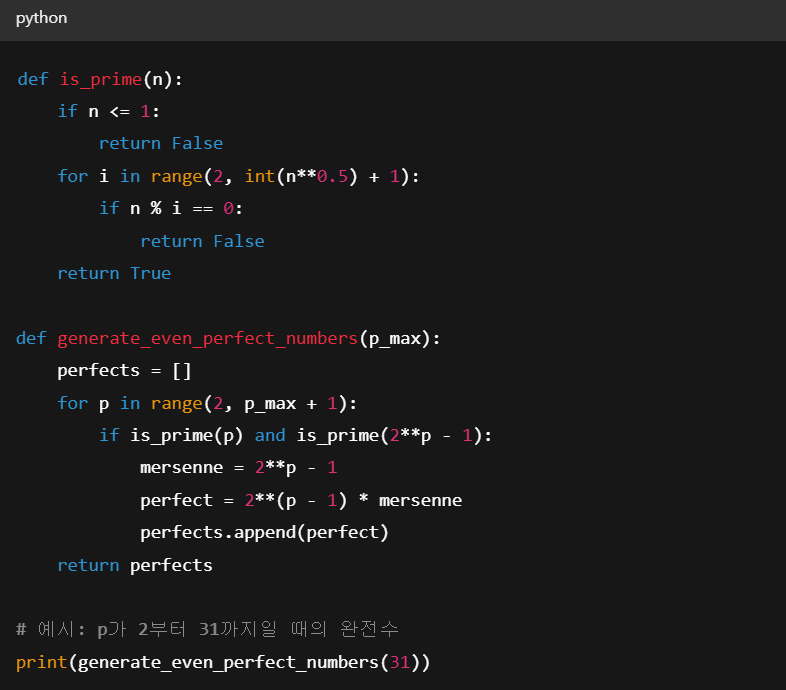 🌟 완전수: 고대부터 사랑받아온 "완벽한 숫자"📌 완전수란?**완전수(perfect number)**는 자기 자신을 제외한 약수들의 합이 자기 자신과 똑같은 숫자를 말한다.✅ 예시 1: 6약수: 1, 2, 3, 6자기 자신(6)을 제외한 약수: 1, 2, 3합: 1 + 2 + 3 = 6 ✅ → 완전수!✅ 예시 2: 28약수: 1, 2, 4, 7, 14, 28제외: 1 + 2 + 4 + 7 + 14 = 28 ✅ → 또 완전수!이처럼 **“약수의 합 = 자기 자신”**이 되는 숫자가 바로 완전수다.🏛️ 완전수의 역사: 수천 년 전부터 사랑받은 개념완전수는 고대 그리스부터 연구되었고, 수학자 피타고라스 학파에서는 완전수를 숫자의 조화로 여겼어.특히 고대인들은 완전수가 우주의 질서나 신성한 상징이라고까지 ..