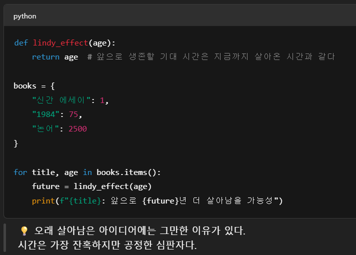 📘 린디 효과 (Lindy Effect)“오래된 것은 더 오래 살아남는다”🎯 Intro출간된 지 2년 된 자기계발서 vs 2,000년 된 『명심보감』.어느 쪽이 진짜 살아남을 지혜일까?린디 효과는 말한다.무언가가 오래 살아남았다면, 앞으로도 오래 살아남을 것이다.📚 법칙 개념**린디 효과(Lindy Effect)**는 비가역적 소멸이 가능한 대상—예를 들어 책, 아이디어, 기술—에 대해현재까지 생존한 시간이 길수록, 앞으로도 생존할 가능성이 높다는 통계적 개념이다.예:1년 된 책의 기대수명: 앞으로 1년50년 된 고전의 기대수명: 앞으로 50년2,000년 된 철학: 앞으로도 2,000년은 거뜬할지도🧪 파이썬으로 표현하기def lindy_effect(age): return age # 앞으로 ..